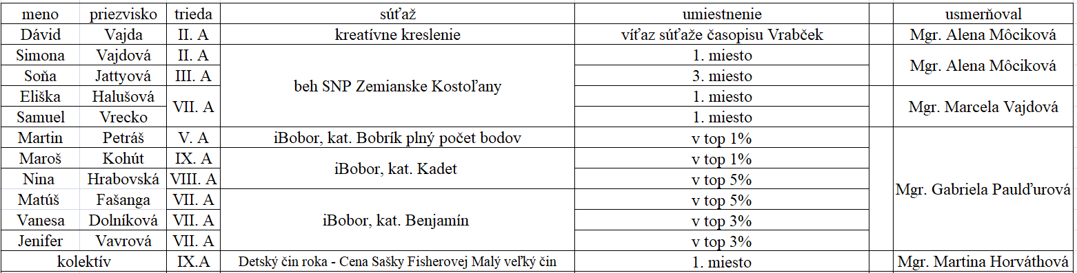 Medzinárodná súťaž iBobor: Viktória Bražinová III. A, Martin Petráš IV. A, Zuzana Vaňová, Sofia Lomnická, Denis Kaňa, Stela Kaňová, Nina Mikulová V. A, Zara Koššová V. B, Peter Mišeje, Vanesa Iliašová VI. A, Nina Haragová, Nikolas Kulich, Lea Špeťková, Sára Mikulová, VII. A